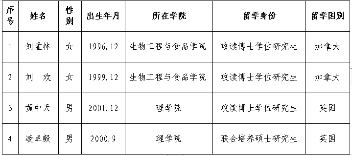 根据国家留学基金委《2022年创新型人才国际合作培养项目选派办法》,经个人申请、外方考核及所在学院推荐,现将拟申报国家留学基金委2022年第二批创新型人才国际合作培养项目的申请人基本情况公示如下: