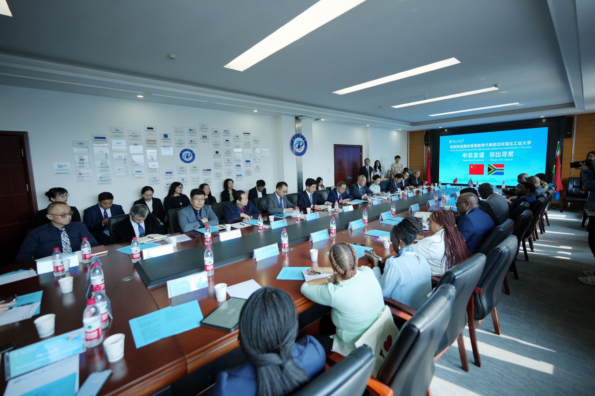 马纳梅拉对我校的热情接待表示衷心感谢。他指出,湖北工业大学对非合作的显著成效令代表团成员印象深刻,他非常欣慰地看到学校与南非多所高校及相关政府部门及企业已经有了深入务实的合作,尤其是与南非文达大学共建的绿色科技孔子学院,除了开展语言教学之外,还在开展光伏氢能等方面的科研合作。他欢迎湖北工业大学和南非更多高校及科研机构建立战略伙伴关系,在学术交流、人才培养、联合科研、技术创新等方面开展务实合作。他表示,南非高教科创部作为推进高教及科学创新领域国际合作的主要政府部门,将不遗余力地支持以湖北工业大学为代表的中国高校与南非高校及企业的交流合作。