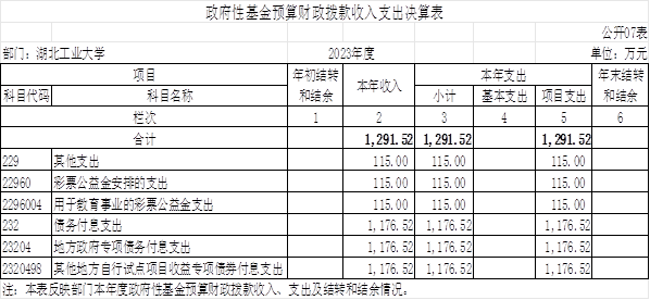 2023年度政府性基金预算财政拨款年初结转和结余0万元,本年收入1,291.52万元,本年支出1,291.52万元,年末结转和结余0万元。具体支出情况为: