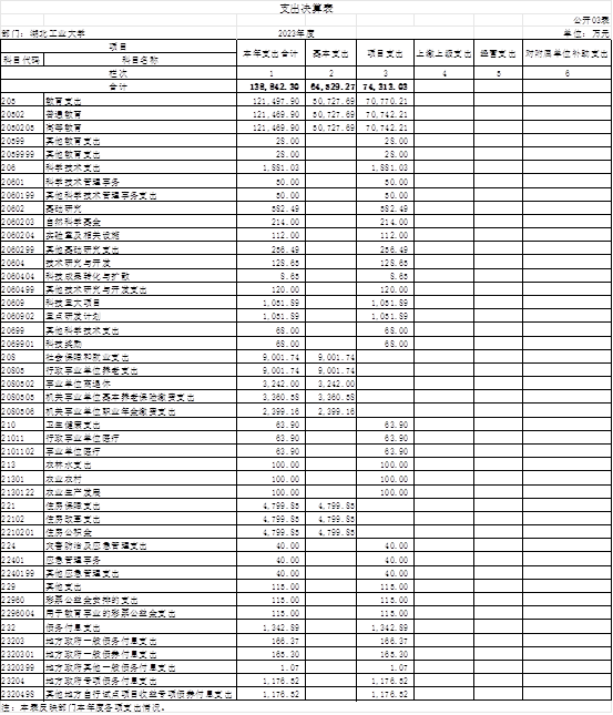 1.教育支出(类)普通教育(款)高等教育(项)。年初预算为71,984.59万元,支出决算为87,530.25万元,完成年初预算的121.6%,支出决算数大于年初预算数的主要原因是年中追加了基建支出、学科建设补助项目、支持地方高校改革发展资金、生均基础拨款扩招经费、学生资助补助经费、改革发展补助项目资金、高等教育债券资金等。